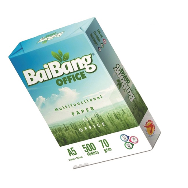 Giấy trắng ngà, in, photocopy Bãi Bằng Office khổ A5 dày 70gsm của Hãng hiấy Bãi Bằng là loại giấy được tin dùng, bới độ đanh của giấy, bề mặt mịn, kích thước chuẩn , độ trắng ngà, in không loá mắt ngày xưa có vỏ màu hồng sau nay thay thành màu xanh thương hiệu Bãi Bằng Office. Giấy có chất lượng tốt, giá hợp lý cho in văn phòng. Sử dụng cho hầu hết các máy in, máy fax, máy photocopy, không lo kẹt giấy